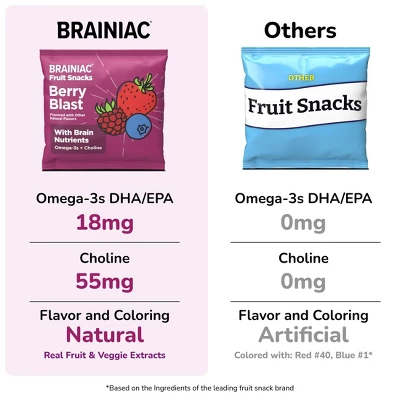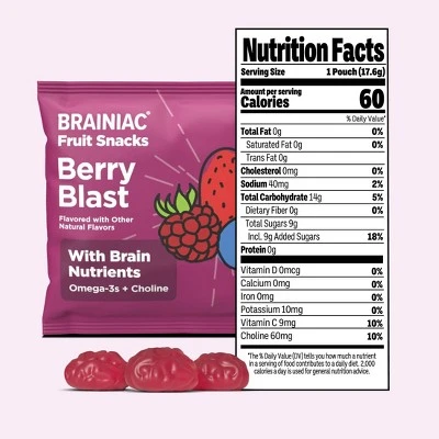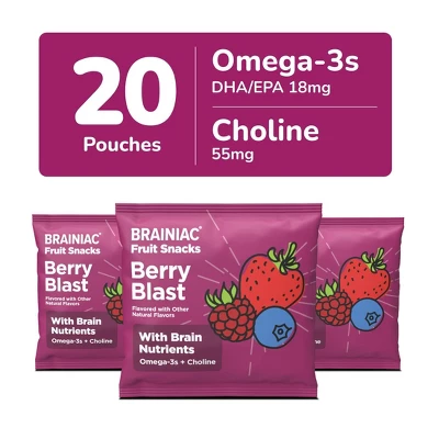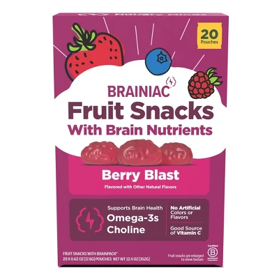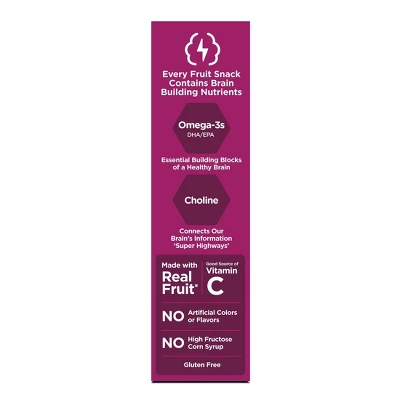 - A SMARTER FUNCTIONAL SNACK: Each box contains 20 bags of Mixed Berry Flavored Fruit Snacks with our patented BrainPack — a blend of key brain healthy nutrients (Omega-3s and Choline). With the perfect balance of brain-boosting nutrients and tasty flavors, kids and parents alike will love these snacks.