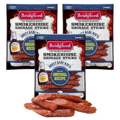 Bridgford Sweet Baby Ray’s Smokehouse Sausage Sticks, a timeless classic crafted with care and tradition. Made with premium ingredients and infused with the irresistible taste of Sweet Baby Ray’s signature barbecue sauce, this smoked sausage sticks delivers a tantalizing blend of smoky, tangy, and sweet flavors. Whether you’re on the go, hiking, camping, or simply enjoying a snack break at home, these sausage sticks offer a premium snacking experience like no other. Each bite delivers an authentic smokehouse flavor that tantalizes the taste buds. Whether you’re craving quick and satisfying meat snacks or need an energy boost on the go, these sausage sticks are the perfect choice