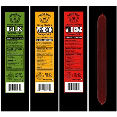Buffalo Bills 15-ct Assorted Exotic Game Sticks (Elk, Venison & Wild Boar) – Two 15-ct Tubs. Our selection of Buffalo Bills Exotic Game Sticks is simply second to none. Unlike our competitors who use a large percentage of beef and/or chicken in their “game sticks”, Buffalo Bills Exotic Game Sticks are made solely with 100% game meat, each one has their own bold and distinctive flavor profile – Bourbon Black Pepper Elk, Honey Mustard Venison, and Smokey Barbecue Wild Boar. Buffalo Bills Exotic Game Sticks contain no MSG, no trans fats, and they are gluten free. Each display tub contains 15 individually wrapped – 5 of each flavor – 1oz sticks averaging 6” in length. Game meat enthusiasts will love them!