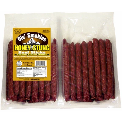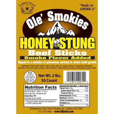 Two pounds of our Honey Stung flavor Buffalo Bills Ole’ Smokies – the mildly flavored twist-end beef stick blended with natural honey. Big and beefy yet slightly sweet, these premium 5″ beef sticks come packed 50 sticks per 2 lb saddlebag. Proudly made in the USA with US-raised beef. Introduced in 2001, our line of Ole’ Smokies continues to be a nationwide hit with customers of all ages. Customers love their old-fashion quality and soft meaty texture (similar to a summer sausage). Buffalo Bills Ole’ Smokies Saddlebags are available in 5 distinctive flavors – Chipotle Habanero, Honey Stung, Mild, Spicy, and Teriyaki.