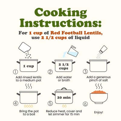 To prepare, rinse 1 cup of red lentils thoroughly. Add to 2.5 cups of boiling water or broth. Simmer for 15-20 minutes or until soft. Add salt or spices at the end of cooking to enhance flavor without toughening the lentils during the process. Warning: Consuming this product can expose you to chemicals including Lead, which is known to the State of California to cause cancer and birth defects or other reproductive harm. For more information go to www.P65Warnings.ca.gov/food