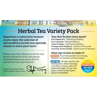 - Twinings Herbal Tea Variety Pack contains Pure Peppermint, Pure Camomile, Lemon & Ginger, Pomegranate & Raspberry, and Camomile, Honey & Vanilla herbal teas, for a total of 20 individually sealed bags inside each box
