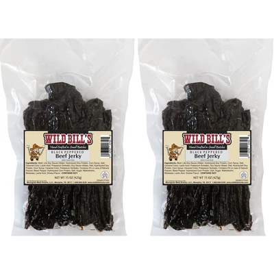 - Includes 2 vacuum-packed 15oz bags of classic Wild Bill’s Black Peppered Beef Jerky strips