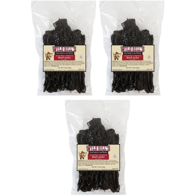 - Includes three 15oz bags of Wild Bill’s 30-ct Original Hickory Smoked Beef Jerky Strips